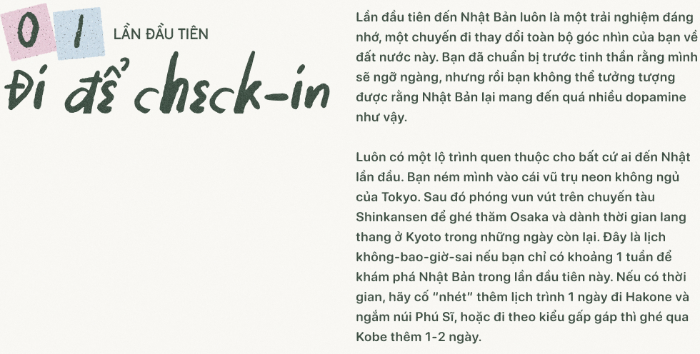 Và thế là hết. 1 tuần đầu tiên ở Nhật Bản của bạn đã kết thúc.Bạn bước ra đường từ 8h sáng, và thấy mình mệt nhoài trở về khách sạn sau 10 tiếng đi bộ ngoài đường. Bạn đã đi teamLab Borderless và có ảnh ở tất cả những căn phòng hot nhất trên Instagram. Bạn đã check-in ở chợ cá Tsukiji với bữa sáng là một khay đầy ắp cá ngừ tươi rói, bạn đã có bức ảnh mặc kimono đi dọc phố Gion, đã chụp vô số hình những máy bán nước tự động đủ màu sắc ở dọc các khu phố. Nhật Bản lần đầu tiên là siêu thị khổng lồ của tất cả những điều “nhất định phải thử”, và bạn đã cố gắng để thử mỗi thứ một chút. Để rồi khi trở về, bạn thấy mình như một đứa trẻ mới liếm được lớp kem ngoài cùng của một chiếc bánh mà bên trong là cả một thế giới với đầy những hương vị và trải nghiệm mà bạn chưa biết gì sất.