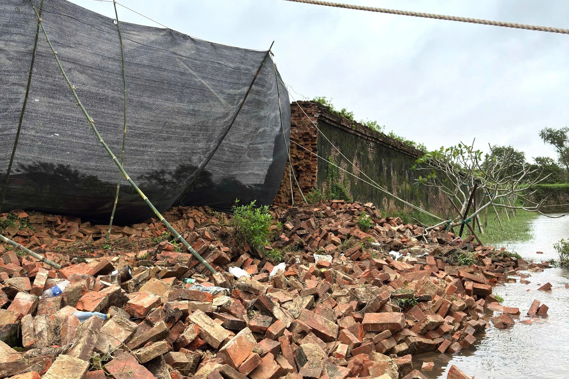 Theo ghi nhận, phần tường bị sập gồm nhiều viên gạch vồ tách rời, thiếu liên kết khối. Kết cấu tường gồm 3 lớp, trong và ngoài xây bằng gạch vồ, lớp giữa độn đất sét. Một số đoạn tường lân cận có dấu hiệu nghiêng vào trong, rạn nứt, kết cấu yếu, có nguy cơ tiếp tục dịch chuyển nếu mưa lớn kéo dài.