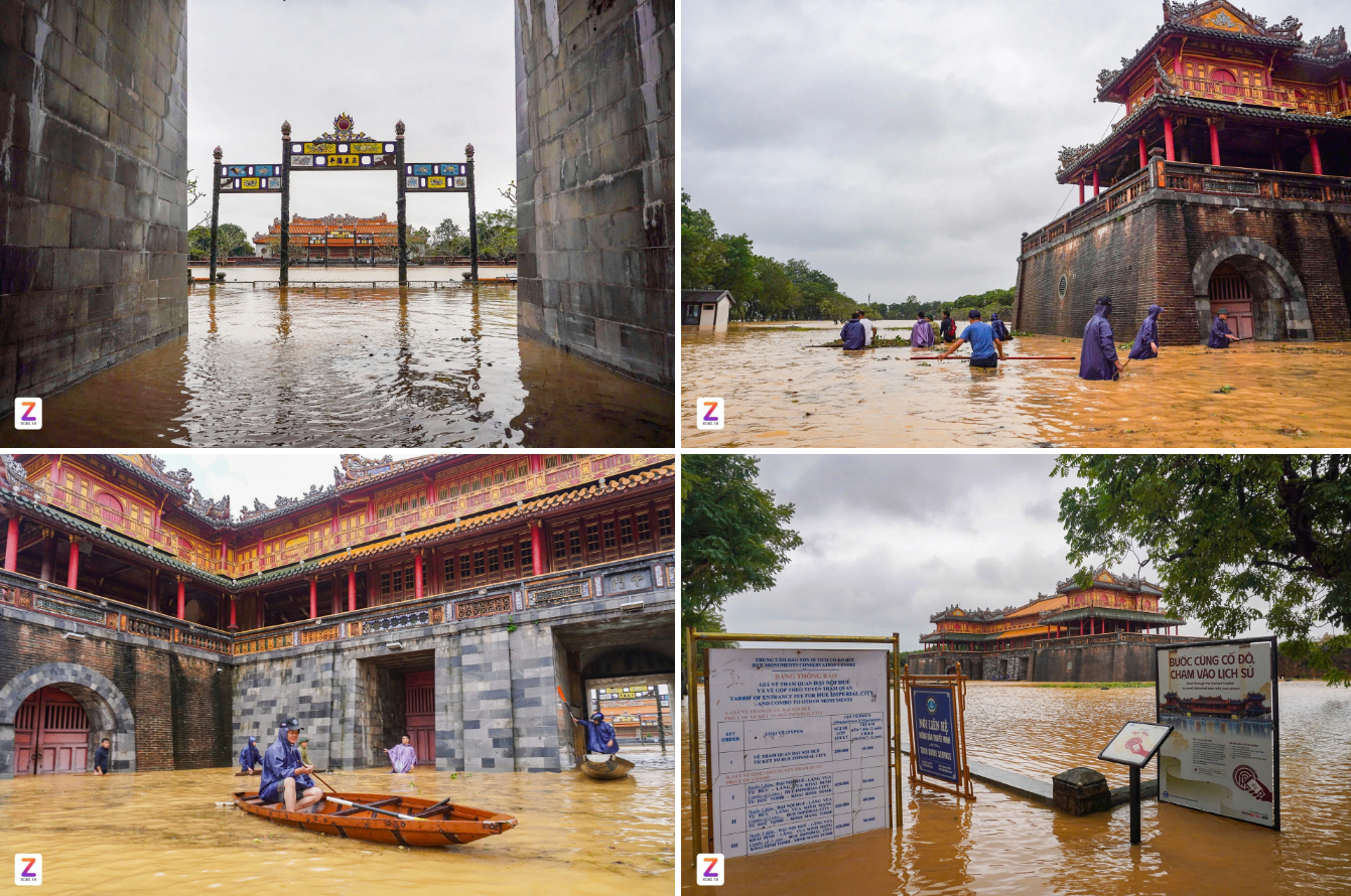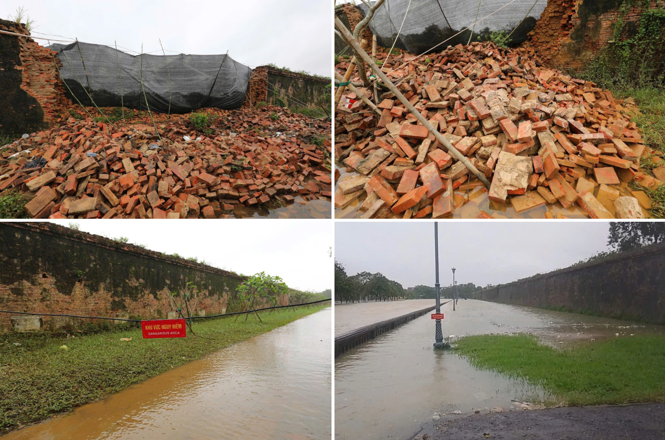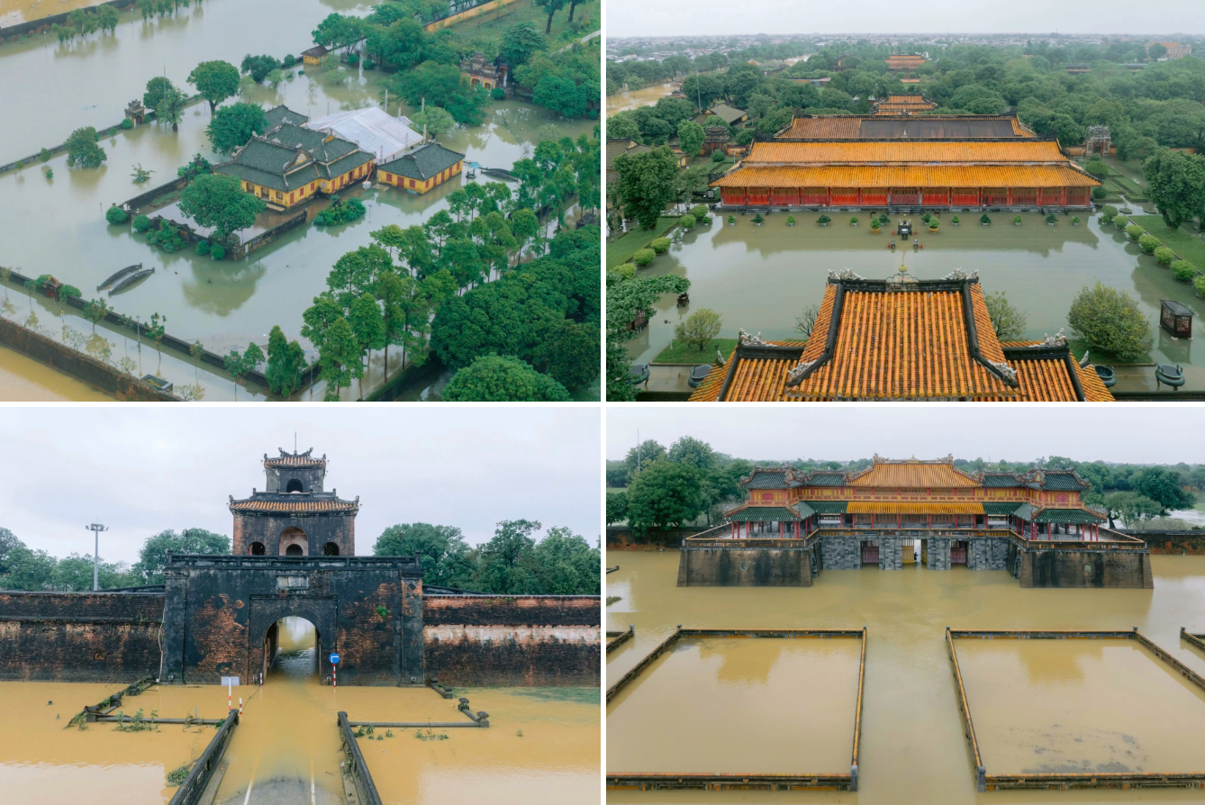 Ngoài sự cố trên, mưa lớn và ngập lụt kéo dài cũng khiến nhiều hạng mục trong Đại nội và các lăng thuộc Quần thể Di tích Cố đô Huế bị ảnh hưởng. Nhiều khu vực sân điện, lối đi có nền gạch Bát Tràng bong tróc, hư hỏng; kè hồ Ngoại Kim Thủy bị xói mòn, tiềm ẩn nguy cơ sụt lún. Tại vườn Cơ Hạ, nhiều cây cảnh bị ngập nước, hư hại, trong khi hệ thống điện, chống sét và công nghệ thông tin bị hỏng, hoạt động không ổn định. Trong ảnh, Đại nội Huế chìm trong nước lũ sáng 30/10.