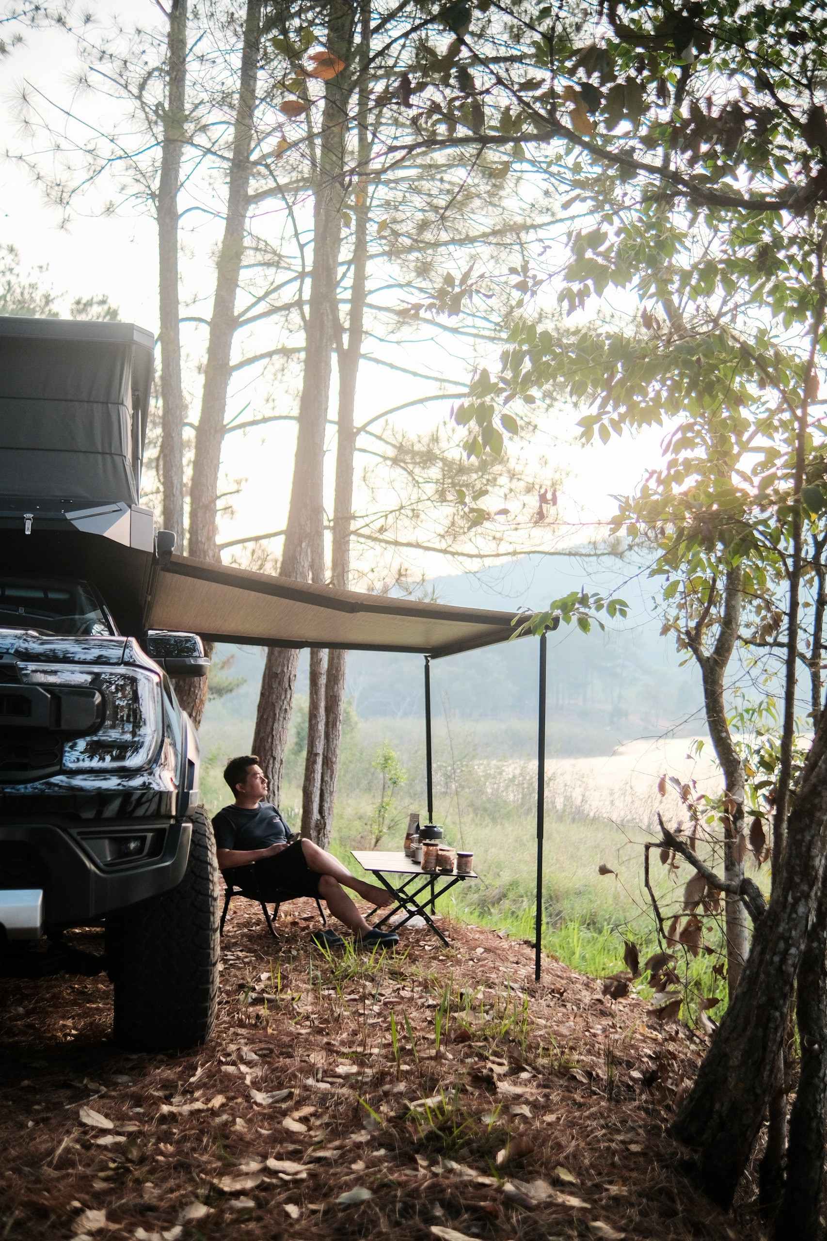 “Trung bình mỗi ngày tôi di chuyển 200-300km. Khi lắp hệ thống nhà di động, chiếc xe bán tải đi đầm và êm hơn, do đó hai bố khá thoải mái. Giờ ăn trưa, ăn tối, tôi có thể mua đồ ở các chợ dân sinh, nhà hàng rồi tìm một nơi vị trí đẹp, kéo mái hiên, hạ bàn ghế để ngồi thưởng thức, ngắm cảnh. Hai bố rất thích kiểu du lịch dã chiến như thế này”, anh Vinh kể.