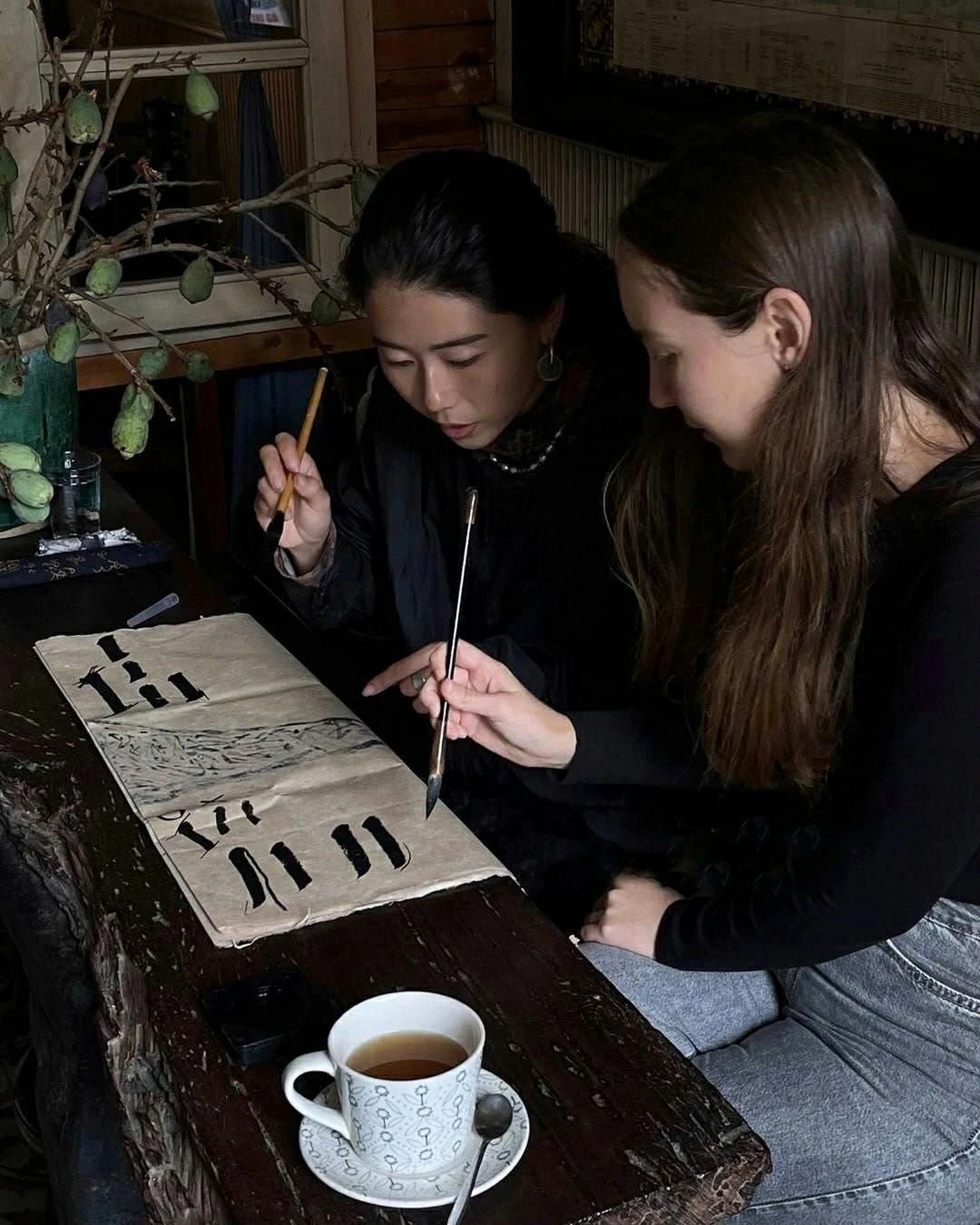 Yuki hướng dẫn một người bạn viết thư pháp (Ảnh: Nhân vật cung cấp).