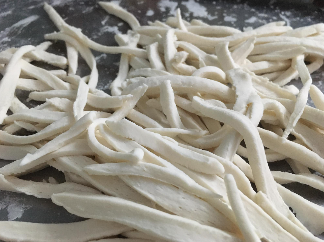 Bột nhào xong, người ta dùng ống tre hoặc chày gỗ, chai thủy tinh cán thật mỏng rồi thái thành những sợi dài vừa ăn.