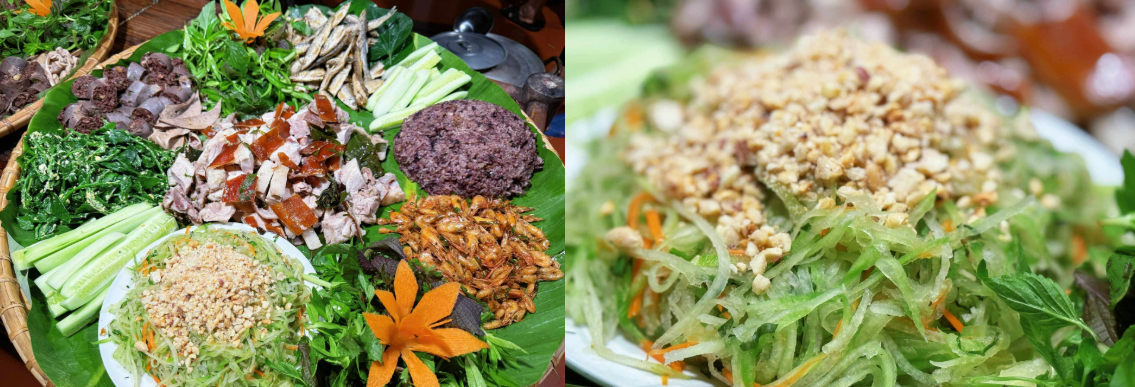 Mâm cơm mời khách ở đây thường không thể thiếu thịt lợn quay, xôi trám, khâu nhục, cá suối chiên giòn, tôm hồ rang lá chanh… và các món chế biến từ đặc sản bí xanh thơm.