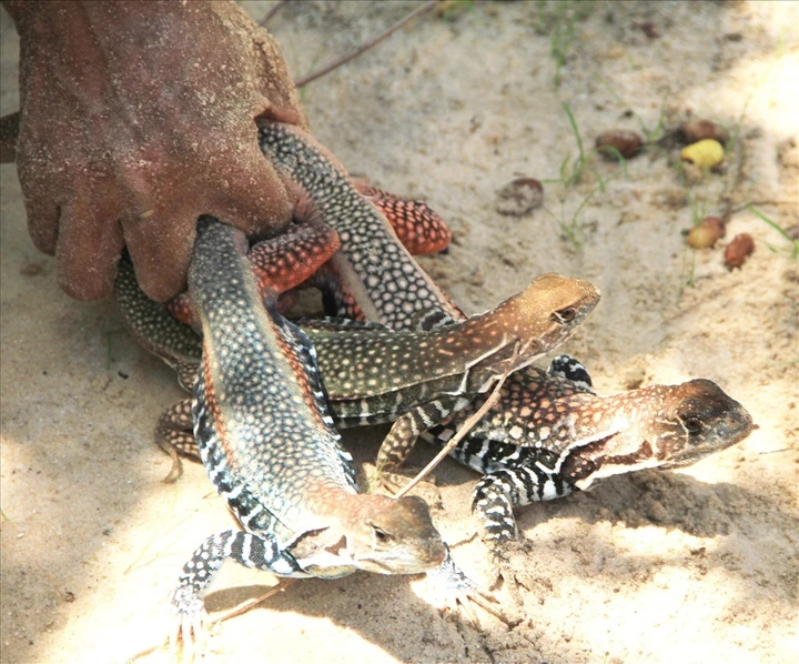 Dông cát xuất hiện nhiều nhất vào mùa mưa, khoảng từ tháng 3 đến tháng 5 âm lịch. Để có thể bắt được con dông, người ta phải đi lên những đồi cát và lần theo dấu chân để tìm hang dông ở. Nhìn hình dáng bên ngoài, dông cát trông khá giống thằn lằn, nhưng kích thước thường lớn hơn. Theo những người sành ăn, thịt dông trắng như thịt gà, có vị bùi và mềm hơn, da giòn giòn sựt sựt, chỉ cần vượt qua được cảm giác sợ hãi ban đầu thì khi ăn rất bắt miệng, hấp dẫn.