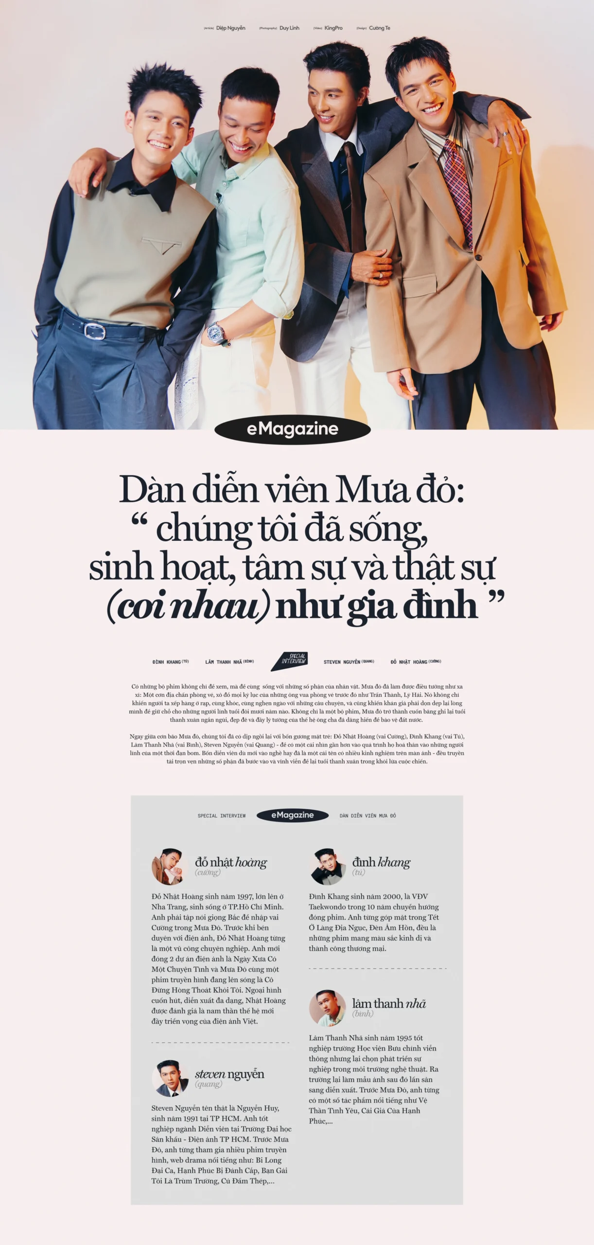 Đỗ Nhật Hoàng: Giây phút cầm vào cuốn kịch bản thì đa số chúng tôi chưa đọc tiểu thuyết, và khi đọc hết rồi thì tất cả đều tưởng tượng ra được những hình ảnh nhất định trong đầu và xây dựng hình ảnh các anh em từ kịch bản đó. Thú thật là tôi chưa được tham gia nhiều bộ phim, nhưng chắc chắn đây sẽ là kịch bản để lại trong tôi nhiều cảm xúc nhất.