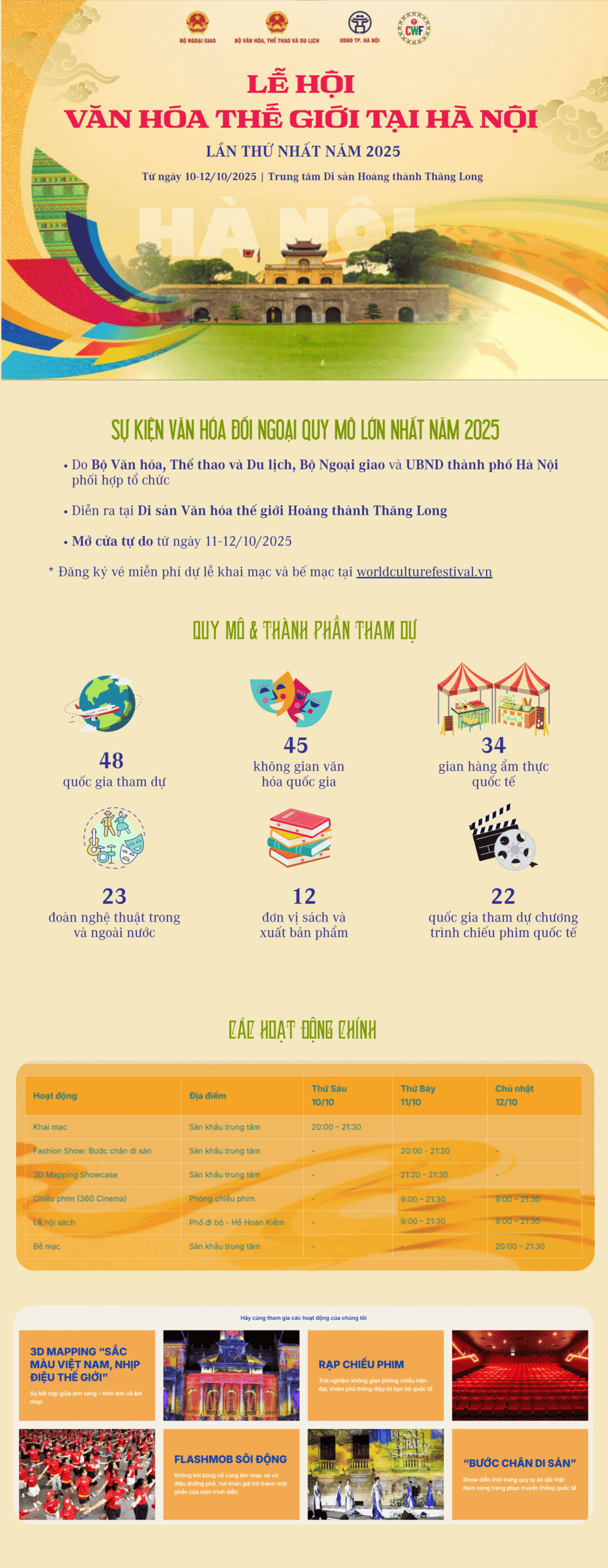 Lễ hội Văn hóa thế giới tại Hà Nội lần thứ nhất được định vị như một ngày hội đa sắc màu, nơi các nền văn hóa gặp gỡ, kết nối và cùng tỏa sáng. Đây không chỉ là dịp giới thiệu tinh hoa văn hóa quốc tế đến công chúng Việt Nam mà còn là cơ hội để quảng bá hình ảnh đất nước, con người Việt Nam đến bạn bè năm châu.