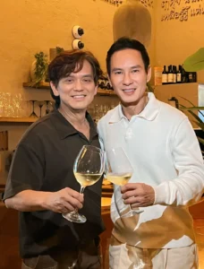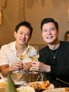 Quang Dũng vui vẻ trò chuyện, cụng ly cùng doanh nhân Tom Han – chồng Thanh Thảo.