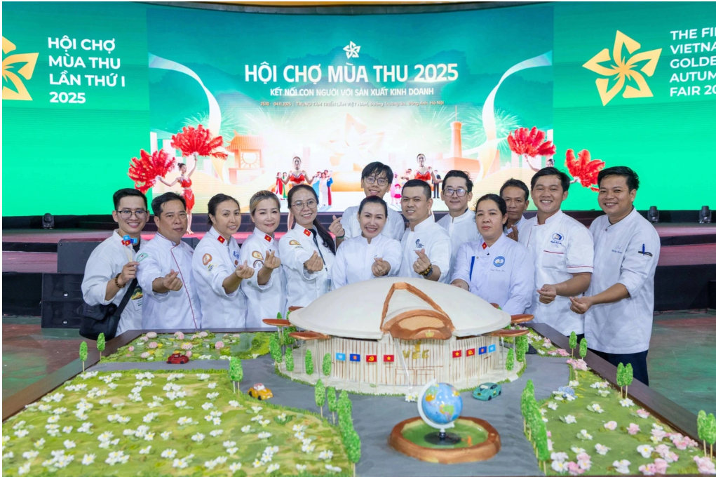 Hội chợ Mùa Thu năm 2025 gây ấn tượng với màn xác lập kỷ lục Việt Nam khi các nghệ nhân đã cùng nhau làm mô hình tái hiện tổ hợp triển lãm lớn nhất Đông Nam Á từ 410kg xôi gấc và 100kg đậu.