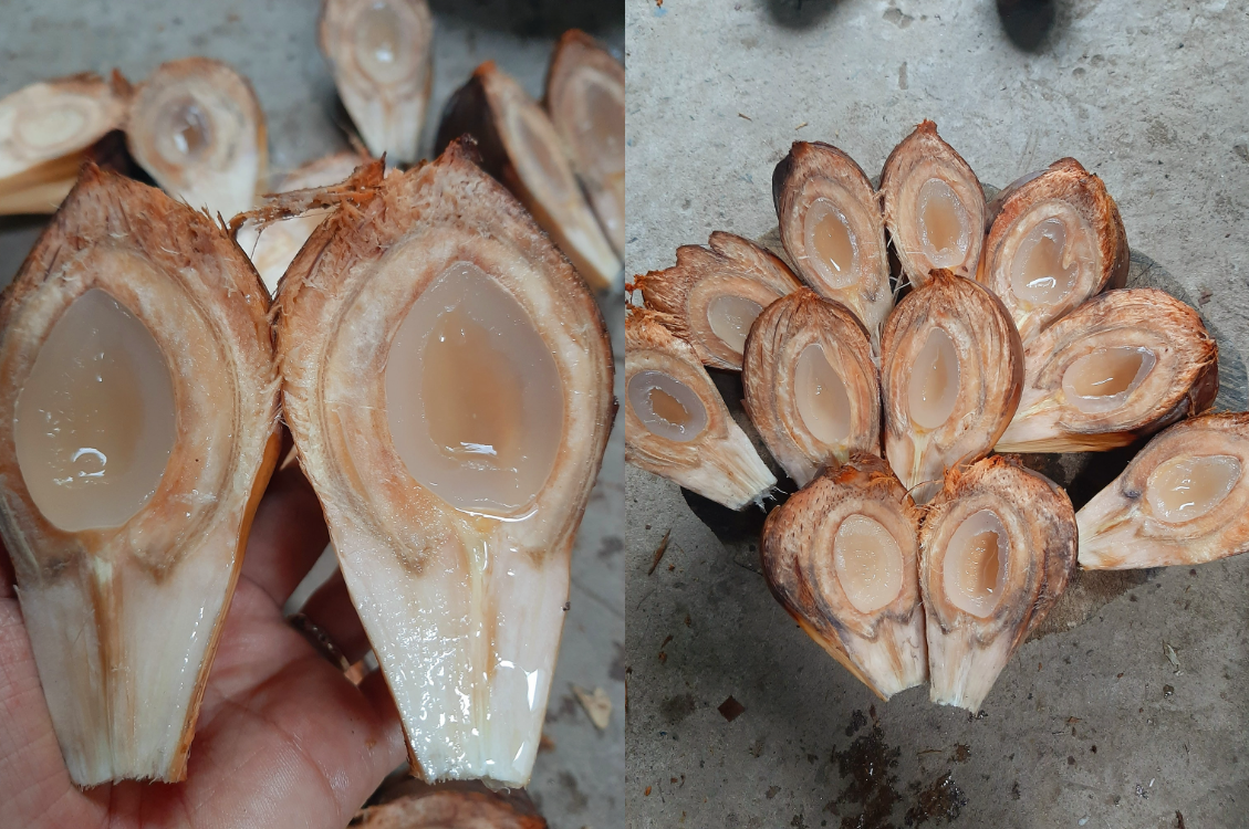 Buồng dừa nước khi chặt về sẽ mang đi đập thật mạnh để từng trái nhỏ văng ra. Từng trái lại được chặt làm đôi, sau đó dùng muỗng tách lấy miếng cơm dừa trắng ngà để “chế biến” món ăn tùy thích.