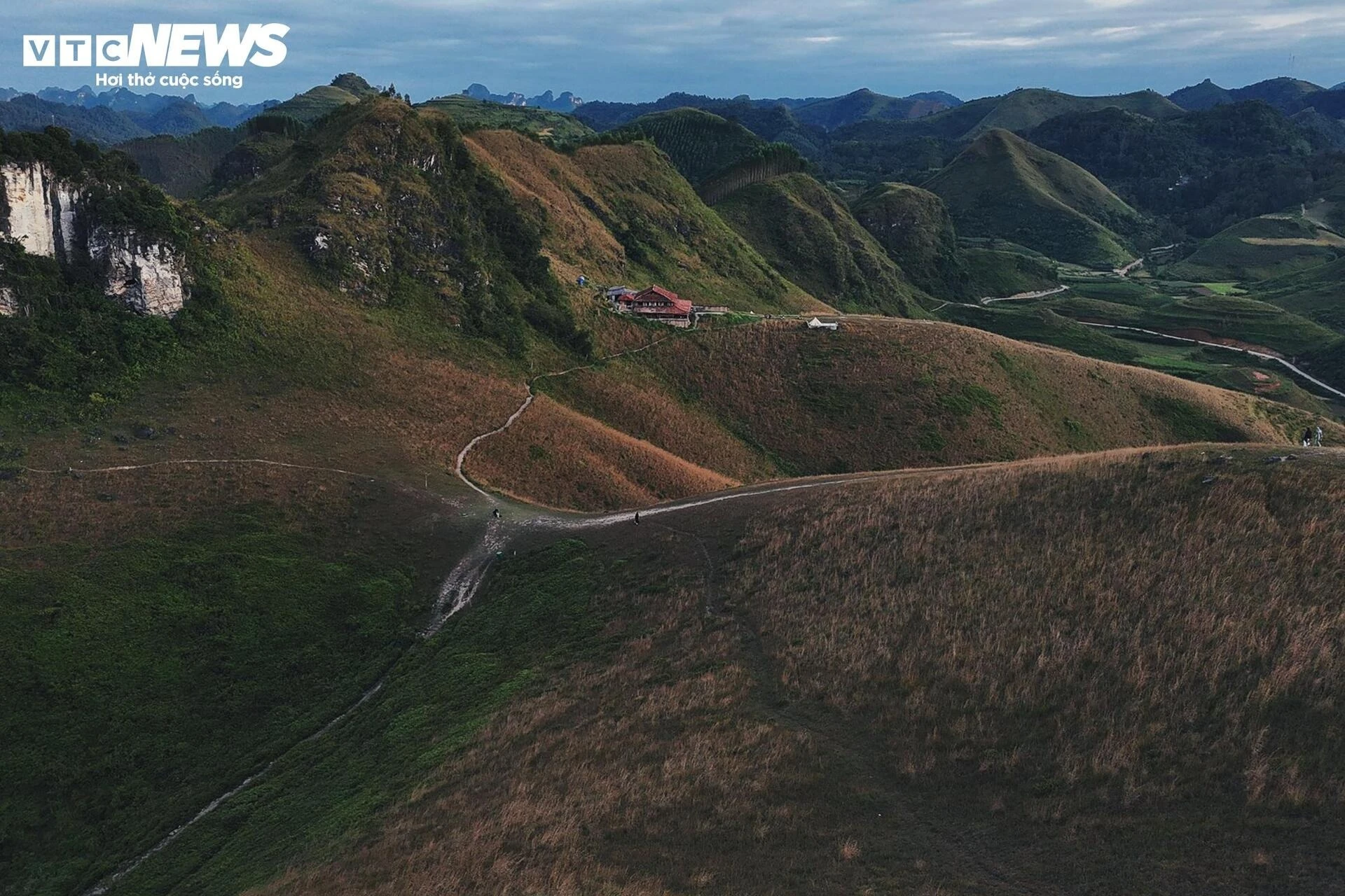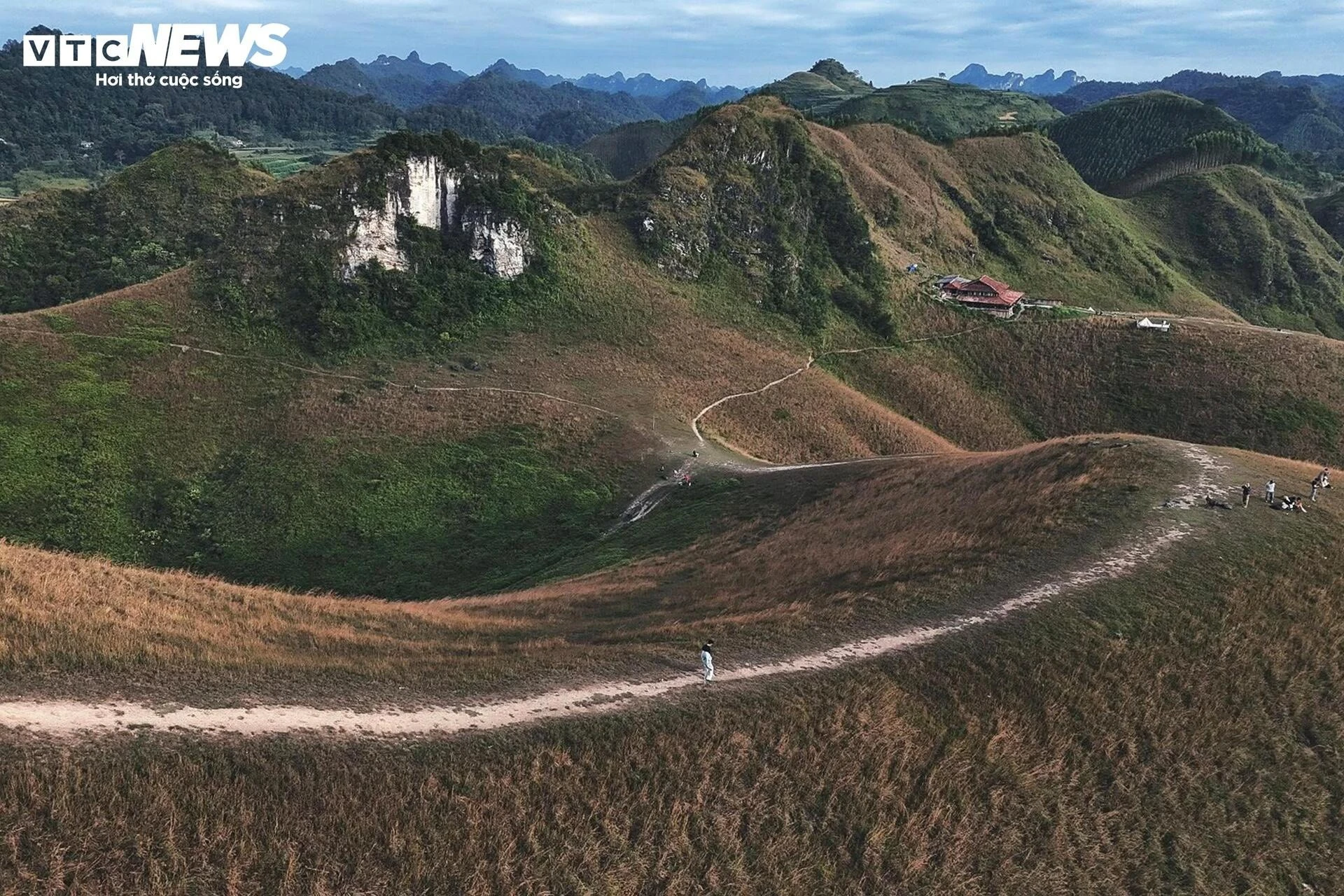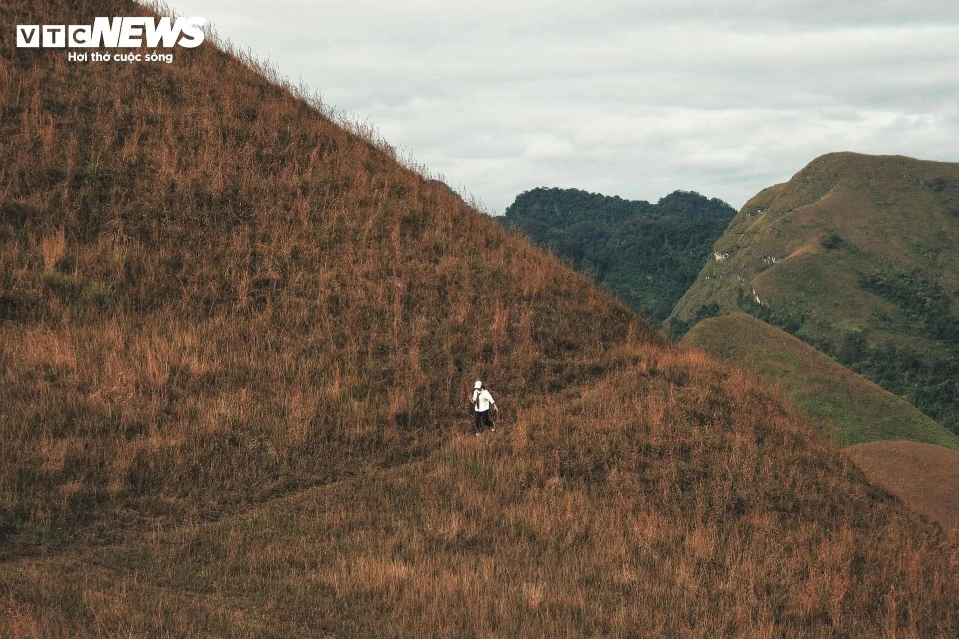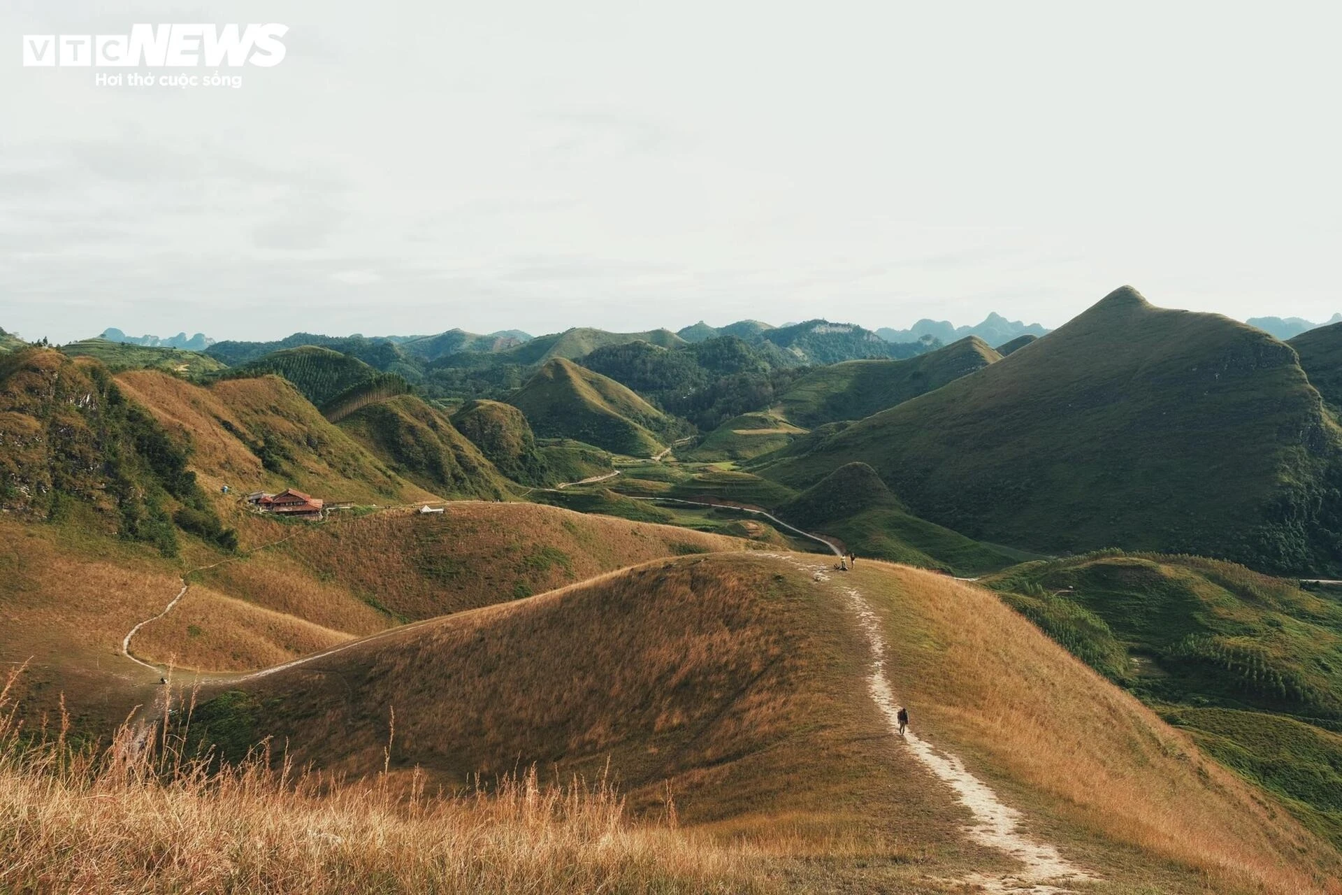 Càng lên cao, không gian càng mở rộng, hiện ra trước mắt là thảm cỏ cháy vàng rực uốn lượn giữa những dãy núi xanh thẫm.
