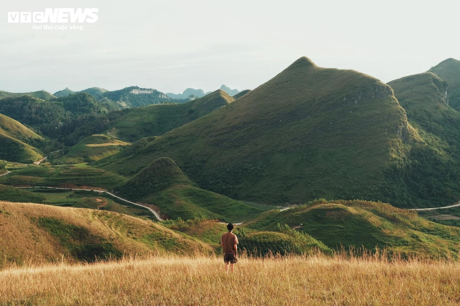 Giữa khung cảnh núi non trùng điệp, những đồi cỏ uốn lượn tạo thành đường cong mềm mại, hút tầm mắt người nhìn.