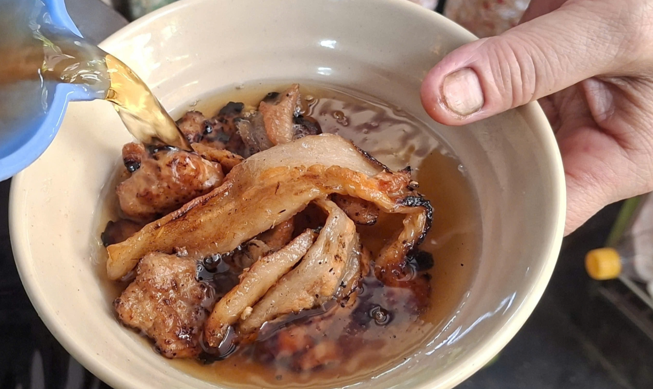 Gần tới giờ đón khách, những vỉ thịt được đem vào nướng xém, mỡ chảy xèo xèo trên than hoa, mùi tỏa ra thơm nức.