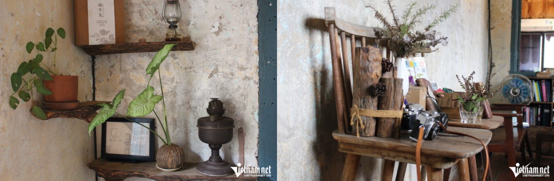 Ngoài quầy pha chế nhỏ xinh, quán chỉ có 3 bộ bàn ghế gỗ đóng theo kiểu cũ. Ba bộ bàn ghế này được bài trí một cách hợp lý trên nền gạch Pháp cổ xen giữa những mảng tường sơn vàng cũ kỹ. Các vật dụng, đồ trang trí tại đây cũng gợi nhắc không gian Sài Gòn xưa.