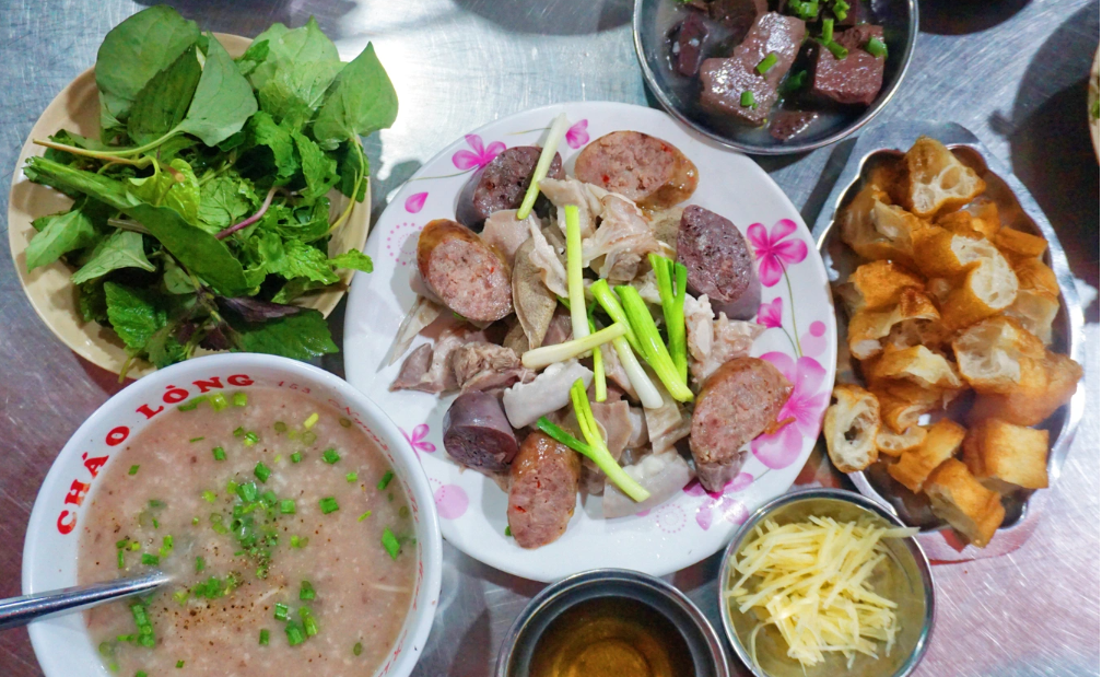 Một lưu ý nhỏ, món “cháo huyết” ở đây không phải cháo nấu cùng huyết khiến cháo đỏ sậm, mà là cháo trắng ăn kèm miếng huyết luộc – cách làm giúp cháo vẫn giữ màu ngà trong khi huyết lại mềm mịn, thấm vị nước dùng.