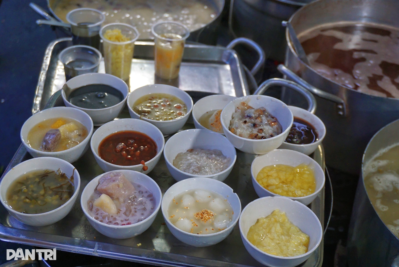 Mỗi chén chè trong mâm là một vị riêng biệt, từ chè mè đen, đậu đỏ, đậu xanh, chè chuối, khoai môn đến bánh flan, rau câu dừa… Chè ở đây có vị ngọt vừa, không gắt cổ, nước cốt dừa béo mà không ngấy.