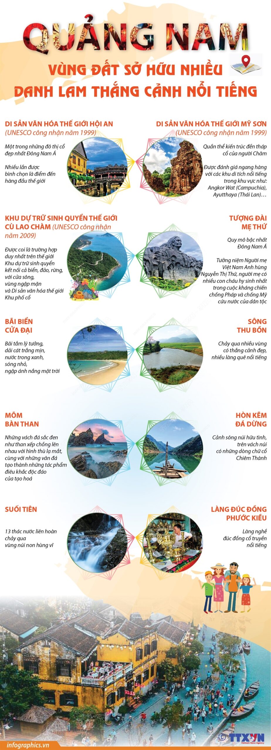 Quảng Nam là một tỉnh thuộc miền Trung Việt Nam, sở hữu nhiều danh lam thắng cảnh nổi tiếng đã được UNESCO công nhận là di sản thế giới. Nơi đây được thiên nhiên ưu đãi cho địa hình đa dạng, phong phú với núi, đồng bằng và biển, cảnh quan tuyệt đẹp và tài nguyên văn hóa có giá trị đặc sắc.