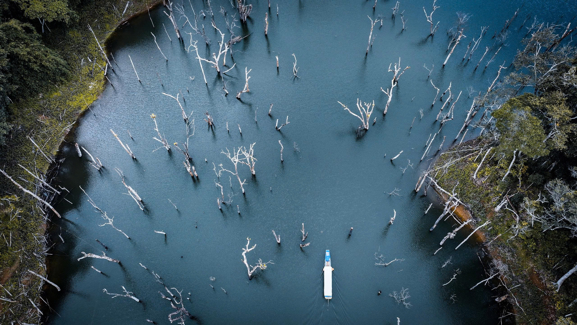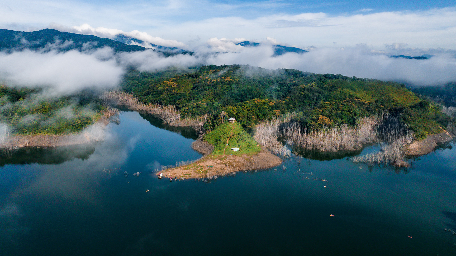 “Con thuyền đi chậm, lướt qua những rặng cây khô héo. Có thân cây dù đã chết khô vẫn vững vàng, thẳng đứng giữa sóng nước, có thân lại nghiêng ngả theo thời gian. Giữa lòng hồ bao la, xanh mướt, khu vực này trở thành điểm nhấn của chuyến hành trình”, anh Tố chia sẻ.