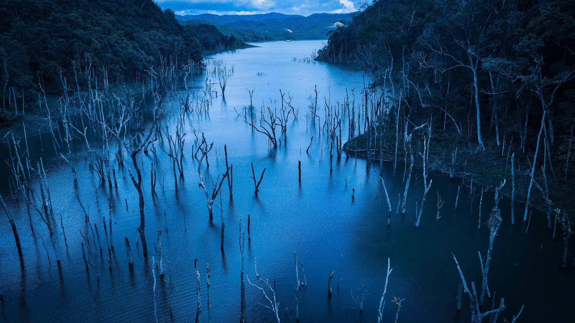 Một điểm khác lạ so với không gian hồ tràn đầy sức sống là khu vực “rừng chết”. Theo tìm hiểu, quá trình tích nước nhiều năm trong lòng hồ của công trình thủy điện đã khiến cho hàng trăm cây rừng xung quanh bờ bị ngập nước, dần chết khô, ngả sang màu trắng ngà.