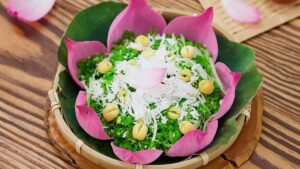 Hạt sen bùi bùi kết hợp chút nếp dẻo, rắc thêm muối mè hoặc dừa nạo tùy chọn, xôi sen là món xôi lành nhất, thơm nhất bạn có thể chọn cho bữa xế.