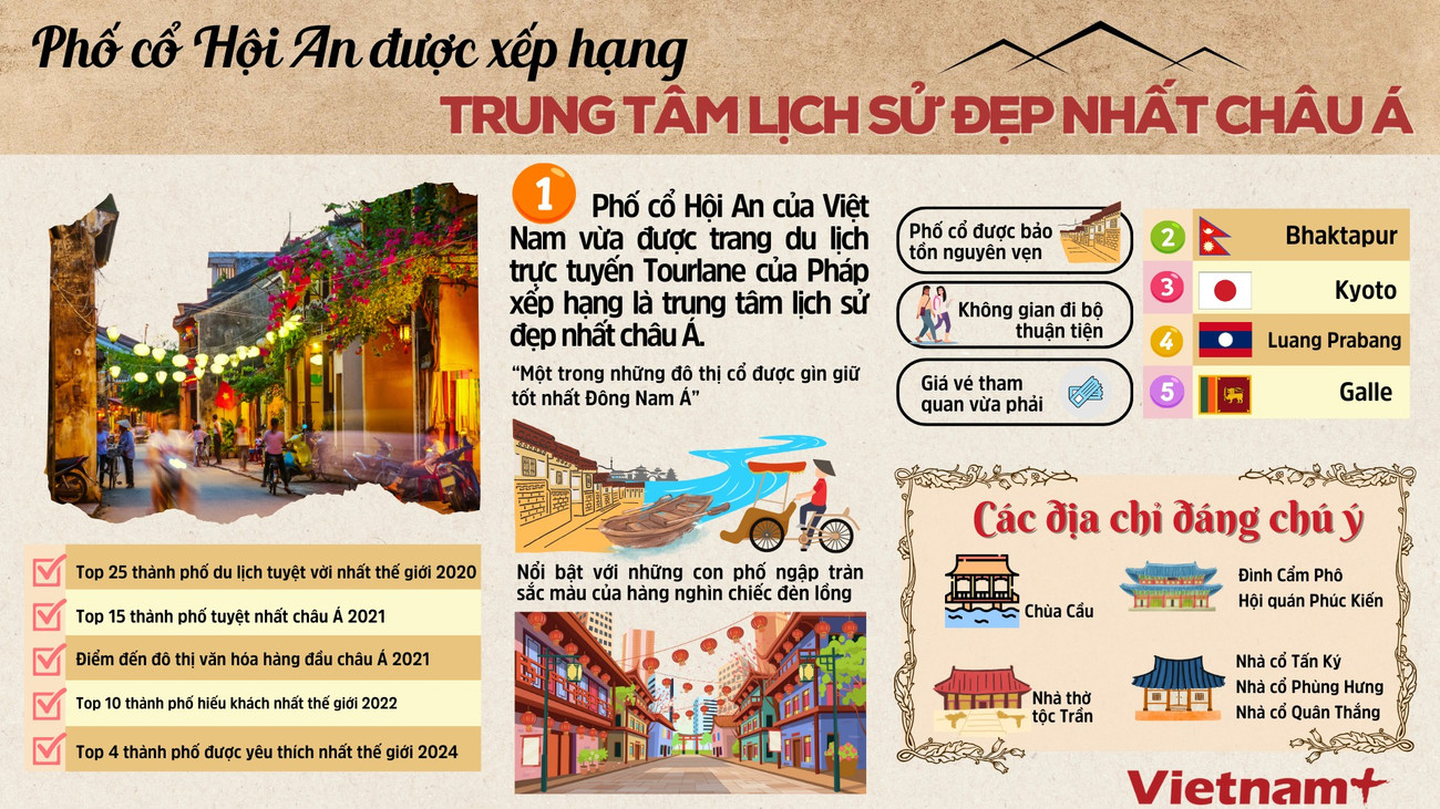 Theo phóng viên TTXVN tại Paris, phố cổ Hội An của Việt Nam vừa được trang du lịch trực tuyến Tourlane của Pháp xếp hạng là trung tâm lịch sử đẹp nhất châu Á, sánh ngang với những di sản nổi tiếng toàn cầu như Krakow (Ba Lan), Avignon (Pháp) hay Cartagena (Colombia).