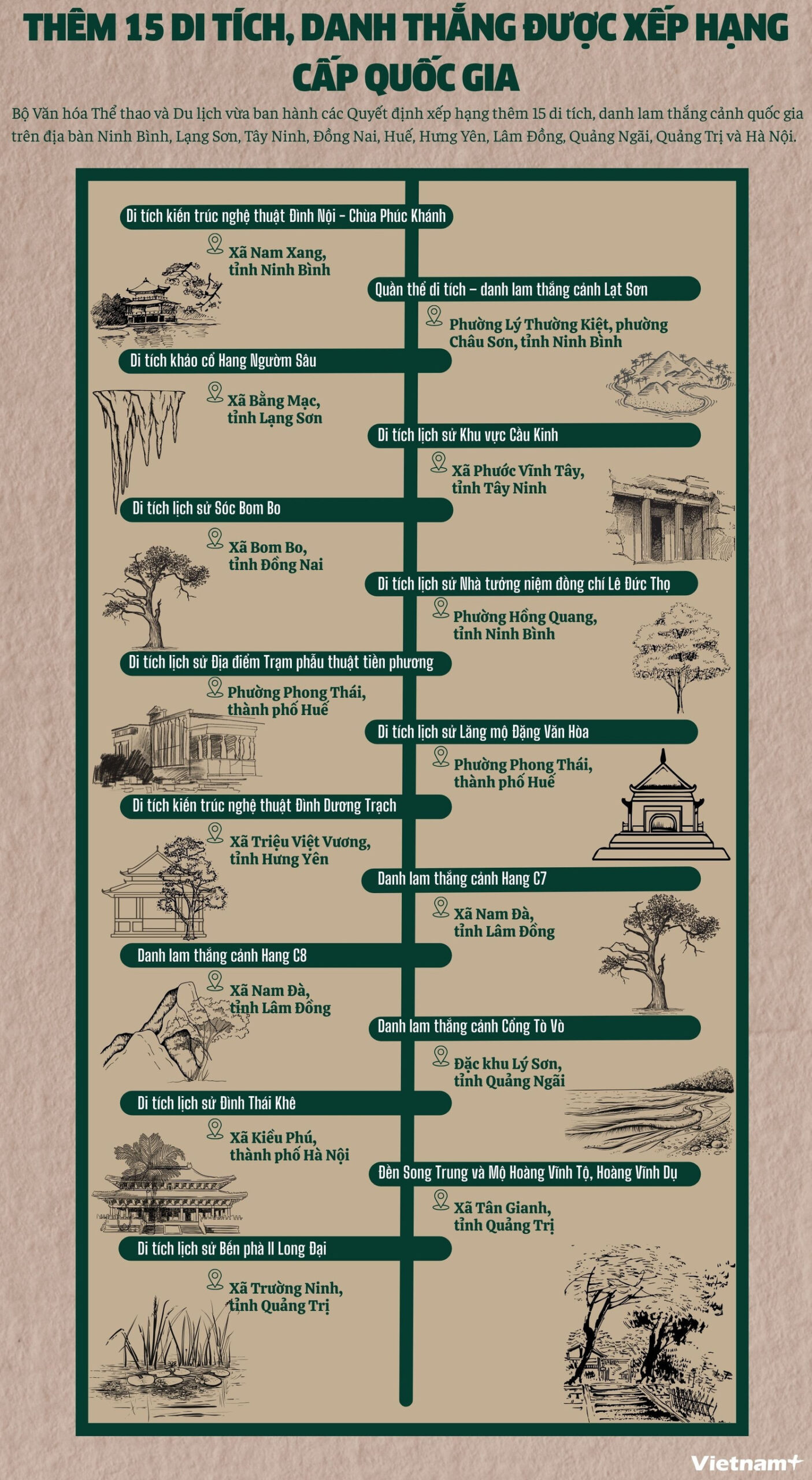 15 di tích, danh lam thắng cảnh trên địa bàn Ninh Bình, Lạng Sơn, Tây Ninh, Đồng Nai, Huế, Hưng Yên, Lâm Đồng, Quảng Ngãi, Quảng Trị và Hà Nội vừa được xếp hạng cấp quốc gia.