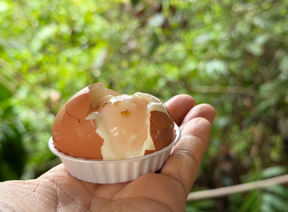 Chỉ mất từ 7-10 phút, du khách có thể vớt trứng từ những hố nước suối khoáng nóng tới 82 độ C, trứng vớt lên lòng đào dẻo quẹo, ăn với rau răm và muối tiêu tắc siêu thơm ngon, nóng hổi.