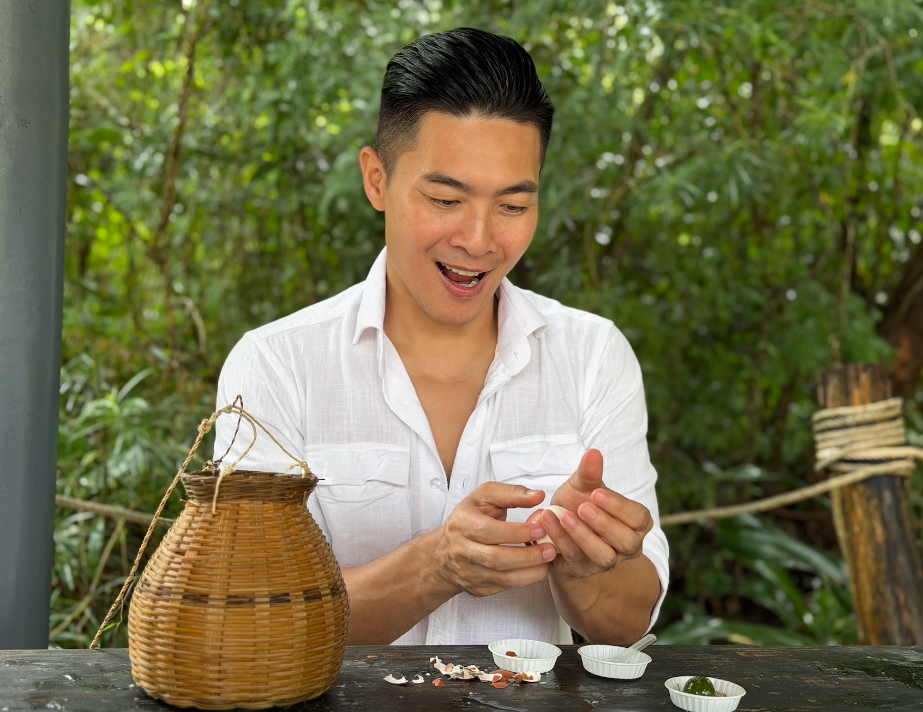 Anh Quốc Cơ cùng bà xã vừa xuýt xoa, vừa nâng niu vì sợ bể lòng đào bên trong. Nam nghệ sĩ chia sẻ: “Tò mò xem vị trứng luộc thì khoáng nước nóng khác gì với nước mình đun thế nào, tôi vừa ăn vừa xuýt xoa, trứng rất thơm”.