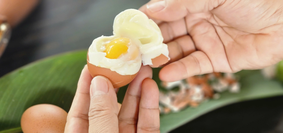 Chỉ mất từ 7-10 phút, du khách có thể vớt trứng từ những hố nước suối khoáng nóng tới 82 độ C, trứng vớt lên lòng đào dẻo quẹo, ăn với rau răm và muối tiêu tắc siêu thơm ngon, nóng hổi.