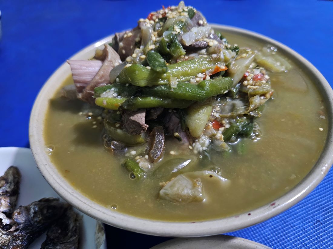 Ngoài rau củ, chị H Quynh còn bán vếch bò nóng hổi. Đây là món súp tổng hợp đặc trưng của bà con buôn làng, bao gồm các nguyên liệu chính như ruột non của bò, gan, đuôi bò…, cùng với nhiều loại gia vị như củ nén, sả, ớt, củ riềng, tiêu xanh, lá é, hoa đu đủ đực, lá ngót rừng, cà đắng.