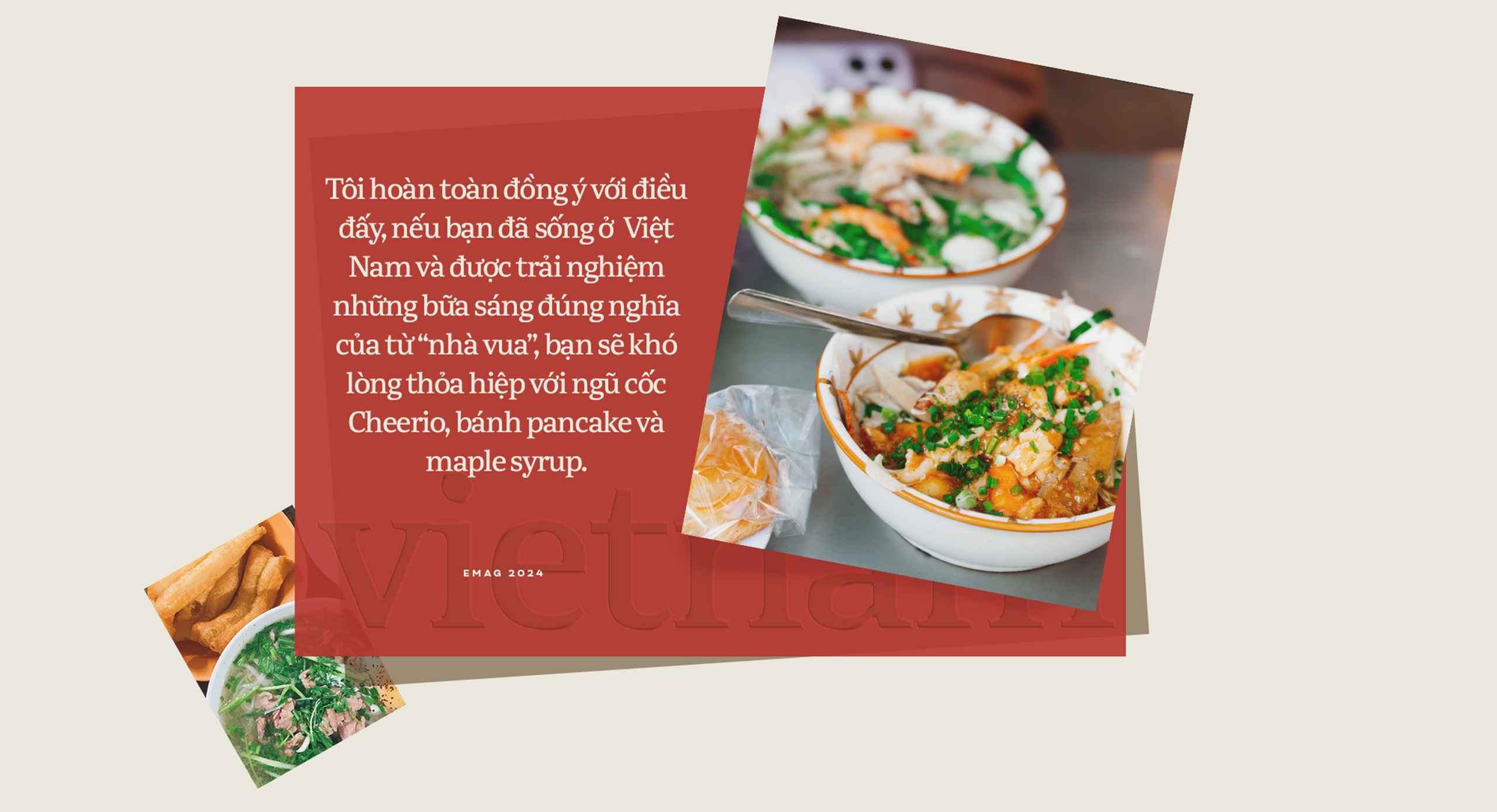 Người ta nói nhiều về hương vị độc đáo và sự cân bằng trong ẩm thực Việt Nam chính là thứ khiến bất cứ ai từng trải nghiệm rồi vẫn sẽ thương nhớ hoài. Tôi hoàn toàn đồng ý với điều đấy, nếu bạn đã sống ở Việt Nam và được trải nghiệm những bữa sáng đúng nghĩa của từ “nhà vua”, bạn sẽ khó lòng thỏa hiệp với ngũ cốc Cheerio, bánh pancake và maple syrup.